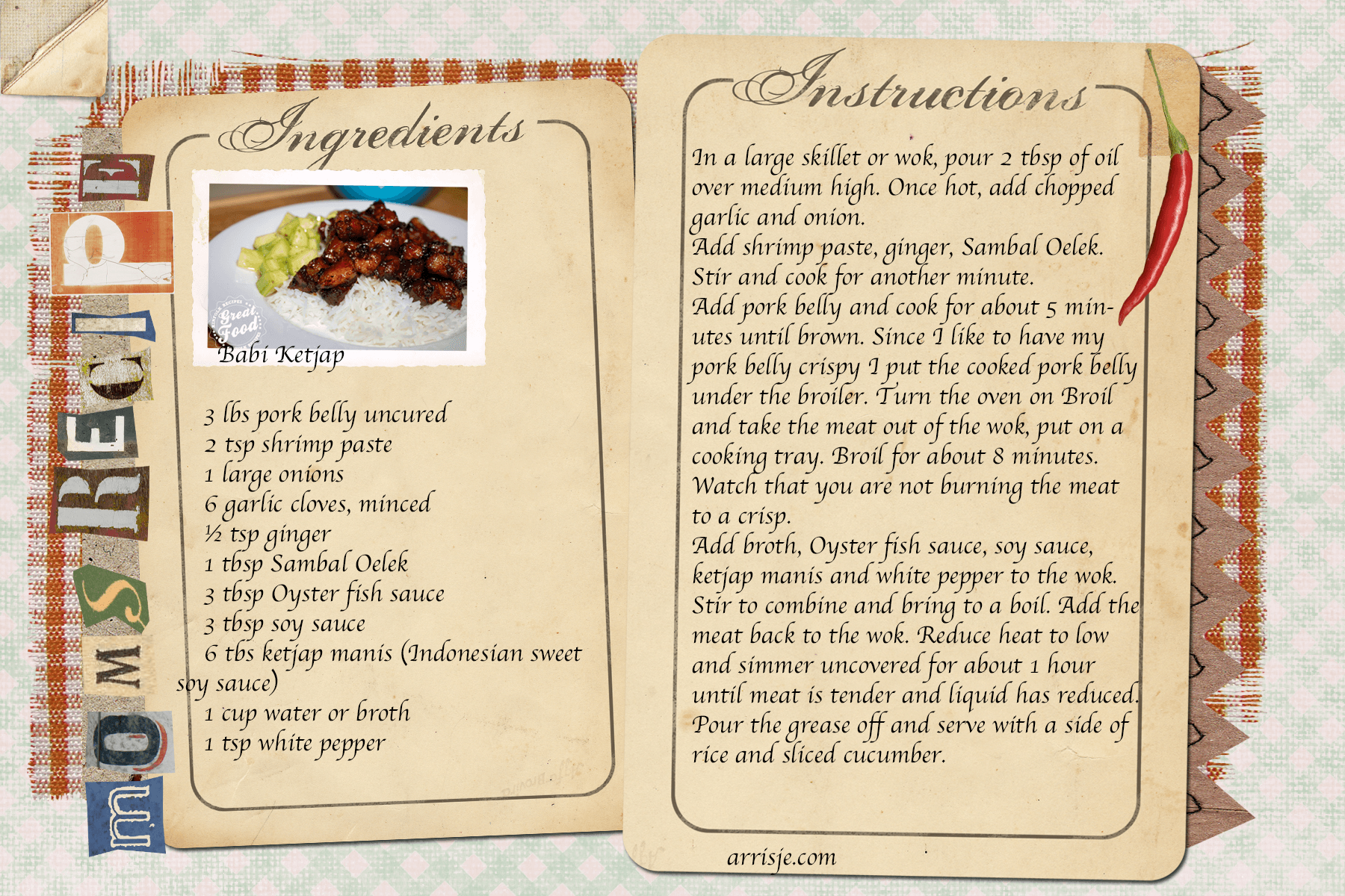 Babi Ketjap or Babi Kecap Is another Chinese-Indonesian dish of pork belly in ketjap sauce. Uncured Pork belly was hard to come by in the USA but lately I am able to get the pork belly in larger grocery stores.