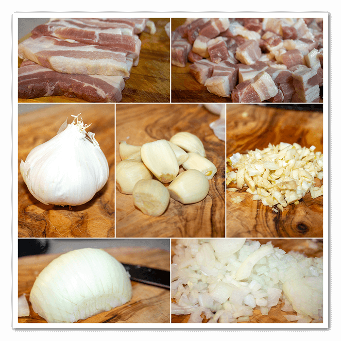 - Cut the pork belly in little chunks. In a large skillet or wok, pour 2 tbsp of oil over medium high. Once hot, add chopped garlic and onion.
