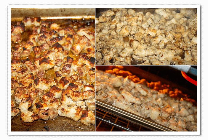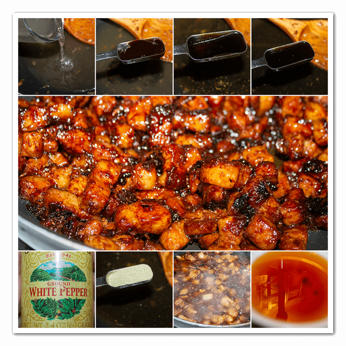 - Add pork belly and cook for about 5 minutes until brown. Since I like to have my pork belly crispy I put the cooked pork belly under the broiler. Turn the oven on Broil and take the meat out of the wok, put on a cooking tray. Broil for about 8 minutes. Watch that you are not burning the meat to a crisp.