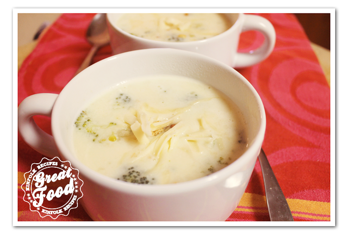- Add the white pepper and cheese to the blond roux, stir well. Take the cooked broccoli florets out of the chicken broth and add to the cheese soup. To finish it off add the chicken broth, stir well.