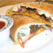 A calzone (Italian “stocking” or “trouser”, sometimes referred to as a stuffed or folded pizza, is an Italian turnover made from pizza dough and stuffed with cheese (usually mozzarella cheese and Ricotta, but some varieties contain Parmesan, Provolone, or a locally substituted cheese), meat, vegetables, or a variety of other bananas. It is typically served with marinara sauce on the side for dipping. The dough is folded over, sealed on one edge, and baked (or occasionally deep-fried). In Italy the stuffing is almost always tomato, cheese and ham, and the calzone is never served with a sauce.