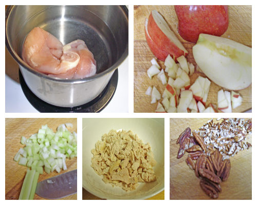 - Boil the chicken or turkey breast for about 20 minutes on simmer. Cut up the apple, crush the pecans and slice up the celery. Combine the mayonnaise with the yoghurt. Add to the same bowl you have the shredded chicken, apple, pecans and the relish. Mix well and add the pepper and salt. Refrigerate at least for an hour.