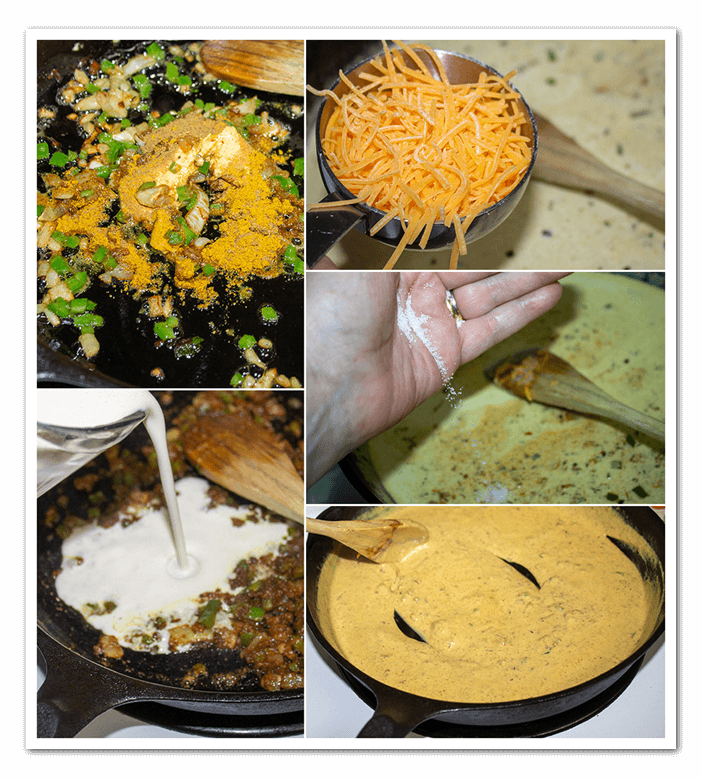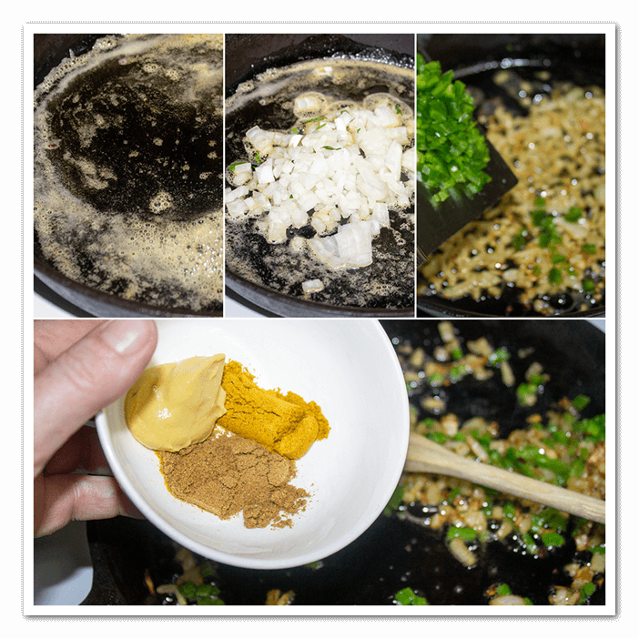 - Add butter to the skillet on medium high heat. Caramelize the onion in a bout 8 min. Add cumin, curry, mustard, and the chili peppers.