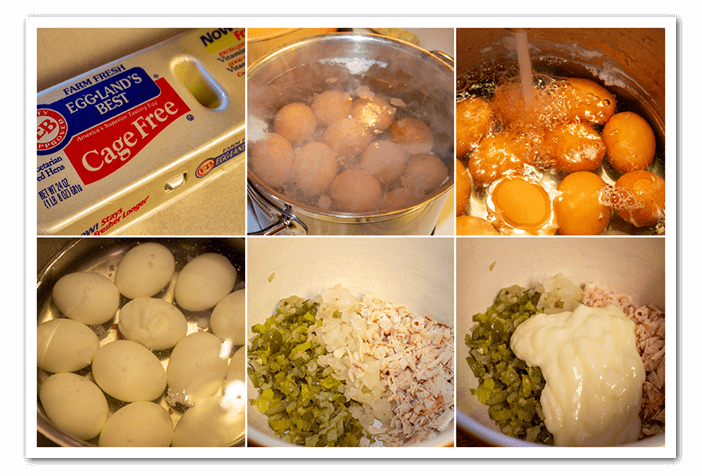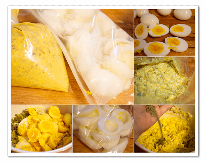 - Boil the eggs for 8 min and peel them. Cut the egg in half and take the yolk out. Mash them up with a fork. Mix the minced cocktail onions, gherkins, ham and mayonnaise, pepper and salt. Mix this all in the egg mixture. You don’t have to fill the eggs with it now you can do that later. Put the egg mixture in a ziplock bag. When you are ready to serve them snip the corner of the ziplock back and squirt the egg mixture into the eggs. Sprinkle with paprika.