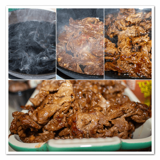 - Add some cooking oil into a wok or a cast iron skillet and cook the meat on medium high to high heat. It takes about 3 to 5 mins to thoroughly cook the meat.