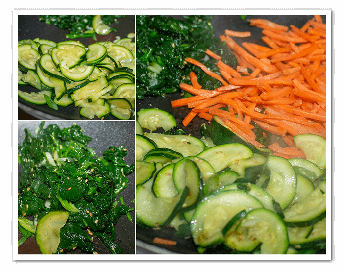 - Add the roasted sesame seeds, sesame oil and sliced green onion, you can either add them raw to the bow or cook the cucumber like you are doing with the remaining vegetables.
