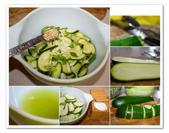 Add salt to the Zucchini leave it for about 15 min. Squeeze out the juice and add sesame, sesame seeds and garlic.