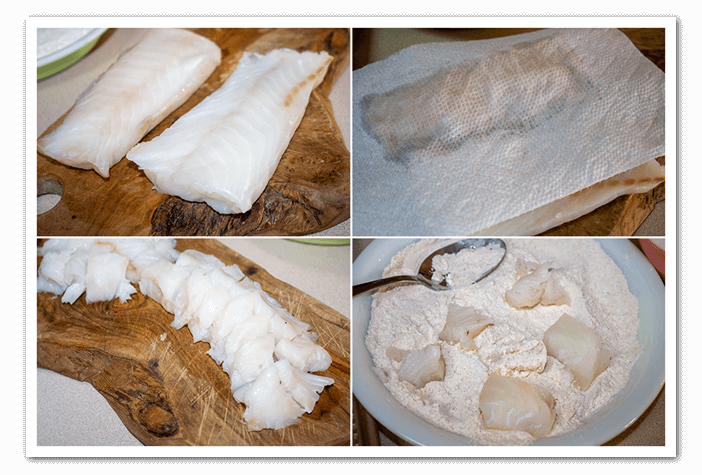 - Rinse the cod in some water. Cut the cod into bite-sized pieces. Put 1 cup of flour in a separate dish.