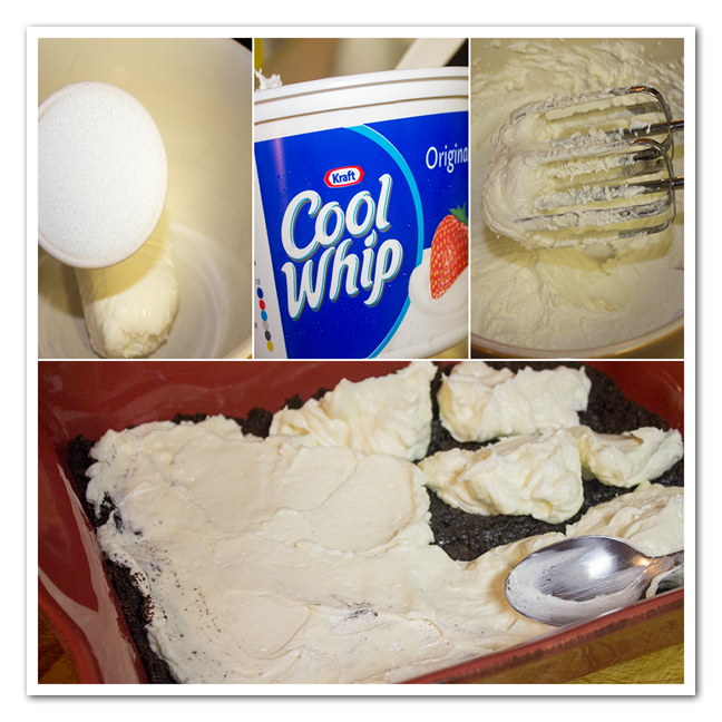 - Mix 1 cup of cool whip and the sugar with the cream cheese spread over the crushed cookies.