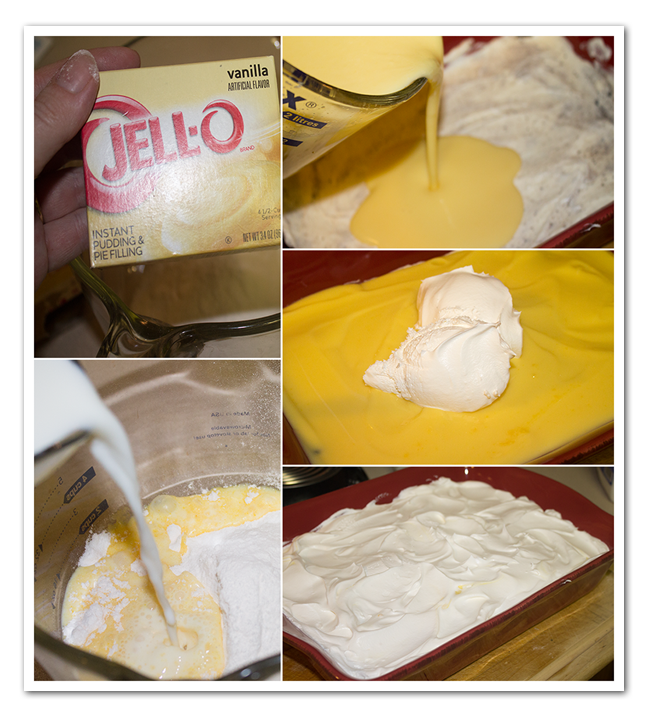 - Mix the pudding and milk and spread on top of the cream cheese mixture.