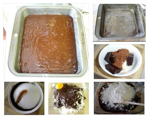 - Preheat oven to 350F and coat an 8" square baking pan with nonstick spray. Melt the chocolate, butter, cocoa and coffee in a bowl in the microwave for 30 sec. Stir until smooth. Stir in sugar, vanilla and salt. Add eggs one at a time, blending well after each addition. Fold in flour. Spread batter in prepared pan. This is the basic brownie, if you want to you can add nuts and bake for 30-40 min.