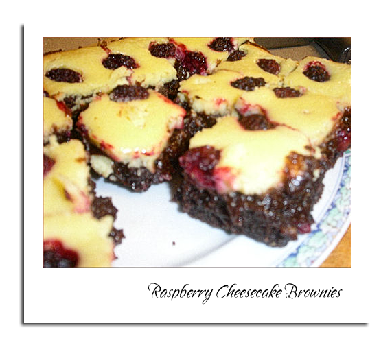 - Cool completely before cutting. In this case we won't bake the brownies just yet. We have to add the cream cheese mix first. Beat the cream cheese, sugar lemon juice mix until smooth. Blend in the egg, the spread cheesecake mixture over unbaked brownie batter. Top with the raspberries (if you like you can add different kind of fruit). Bake for 1 hour or until cheesecake is set and golden around edges. Cool brownies in pan cover and chill overnight. Dust with powder sugar.