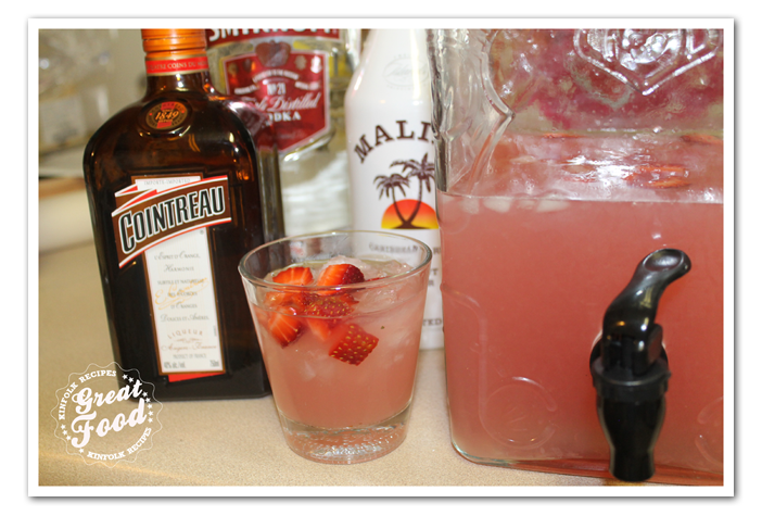 - Pour out the Strawberry Lemonade into another container. Pour back into container: 1 cup vodka, 1/3 cup triple sec (I use Cointreau), 1/3 cup Coconut rum (Mailibu), Cut up 4 or 5 strawberries. Refill the container with the strawberry Lemonade.