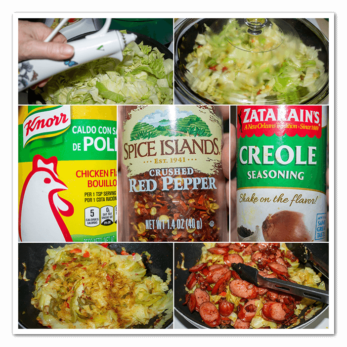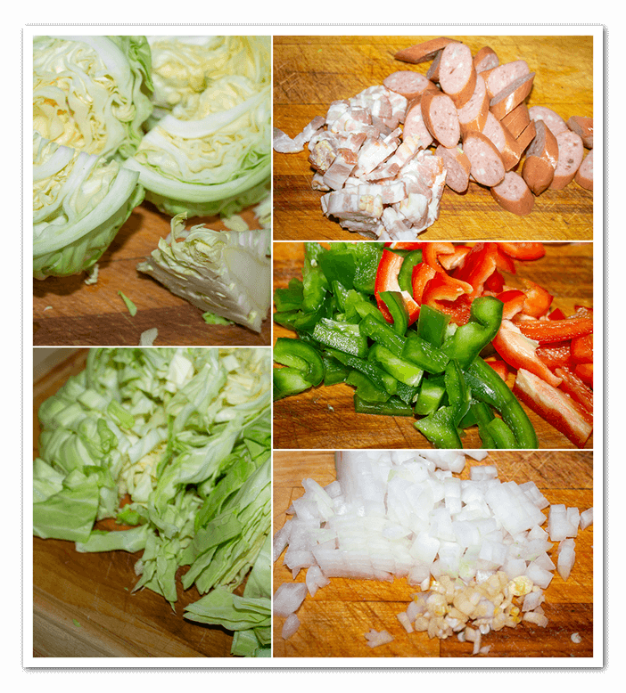 - Prep the cabbage by removing the core and cutting it into slices. The key here is to ensure we remove the core, as it can make the cabbage bitter. Also prep the bell peppers, onions, garlic, sausage, and bacon.