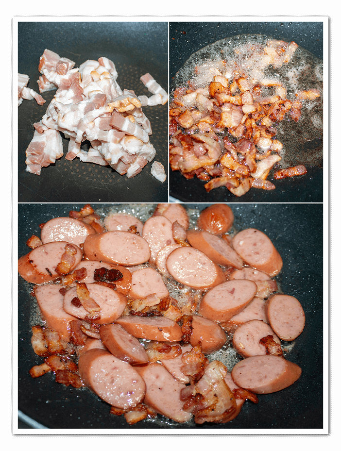 - Start by searing the bacon until it renders its oil. After removing the bacon, add the sausage to the pan. Once its nicely browned, set aside.