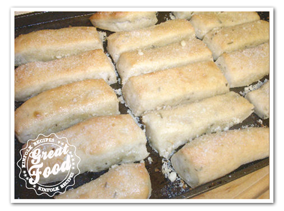 Place all ingredients in mixer. Mix with paddle. Let rise 30 minute Punch down and let rise again for 30 minutes. Roll out and cut into sticks with pizza cutter. Place onto greased cookie sheets. Let rest 15 minutes. Bake in 375 for, baste with the garlic butter every 10 min until light brown. Should take about 45 min. While still hot from the oven brush with melted butter and sprinkle with dried Parmesan cheese and or Mozzarella cheese. Serve warm.