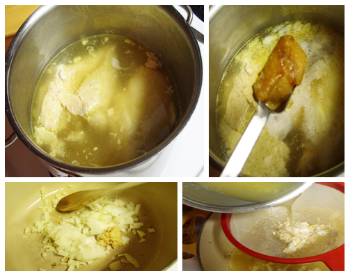 - Put the chicken breast in a pot, add enough water to cover the chicken. Add the chicken base and simmer (about 1.2 hour) or until the chicken is done. Cut the onion up, add 1 tbsp olive oil to the skillet and add the onion and garlic, brown lightly.