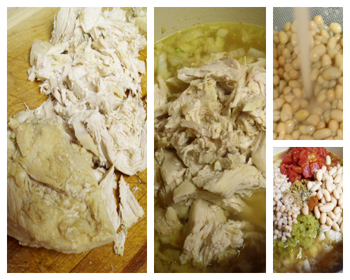 - Take the chicken out of the broth, and strain the broth. Shred the chicken and put it back in the broth. Add the beans, tomatoes, chiles, onion, garlic and seasonings. Simmer for about an 1/2 hour. Serve with some Monterrey Jack Cheese and green onions. If you like it thick simmer till the stock is more reduced.