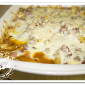 Spray some olive oil in the baking pan put the Ziti mix in first then top off with the meat mixture. Sprinkle with the Parmesan cheese and the rest of the mozzarella. Spray the foil with some olive oil that will prevent the cheese from sticking to the foil. Bake in 350F oven for 20 minutes.