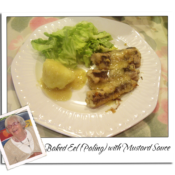 Take the eel out of the oven dish and pour the liquid in a pan. Add 1 tbsp grainy mustard. (sorry no picture of that mom worked fast ;)) Dilute the cornstarch with water and add to the sauce. Whisk well. Pour over the eel.