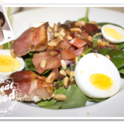Put the salad greens on the plates top with the bacon wrapped goat cheese, sliced boiled eggs, Roma tomatoes and the toasted Pine Nuts. Pour the Balsamic Vinaigrette over the salad.