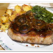 In a preheated skillet add Olive oil. Sear the Sear Pork Chop over medium heat on both sides for two minutes. Turn the chops and add the mushroom and sliced garlic, sear for two more minutes. If there is still oil left in the pan drain it. Add the red wine. My choice was Barefoot sweet red. Add the chicken stock and cover the pan, cook over medium heat for 2 minutes.